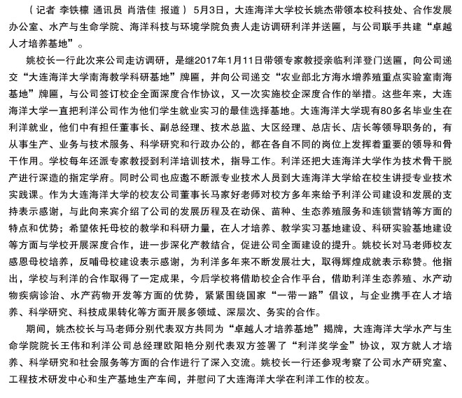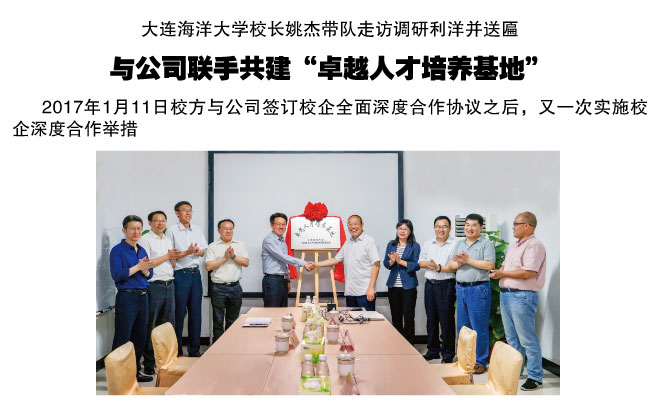 大連海洋大學(xué)校長(zhǎng)姚杰帶隊(duì)走訪調(diào)研利洋并送匾與公司聯(lián)手共建“卓越人才培養(yǎng)基地”