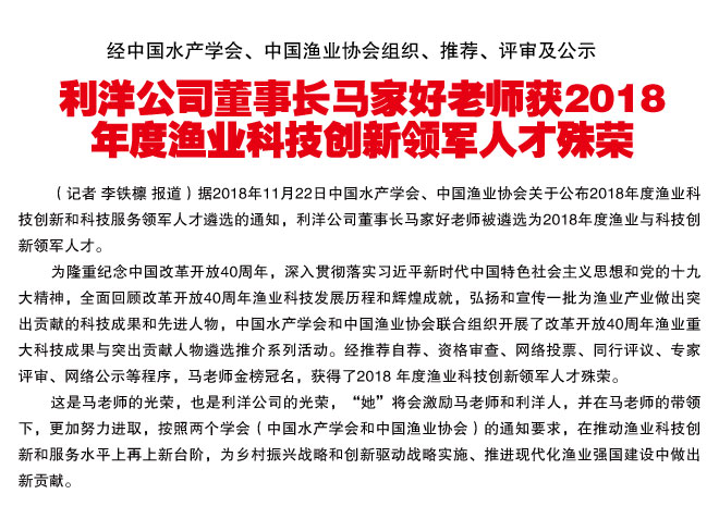 利洋公司董事長(zhǎng)馬家好老師獲2018年度漁業(yè)科技創(chuàng)新領(lǐng)軍人才殊榮
