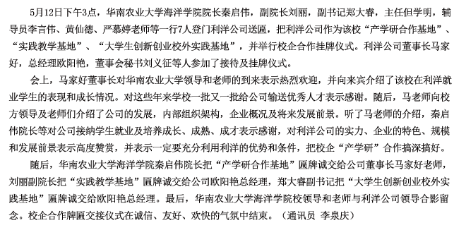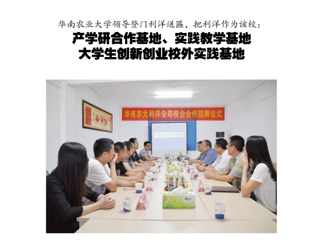 華南農(nóng)業(yè)大學(xué)領(lǐng)導(dǎo)登門利洋送匾,把利洋作為該校產(chǎn)學(xué)研合作基地、實(shí)踐教學(xué)基地